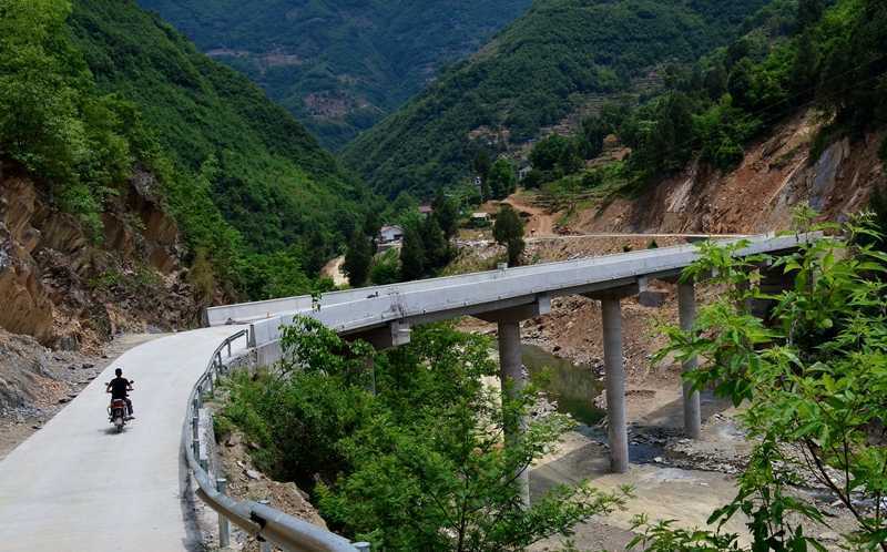 2020年6月1日,一位村民騎著摩托車正準(zhǔn)備從寧強(qiáng)縣安樂河鎮(zhèn)唐家河大橋駛過。